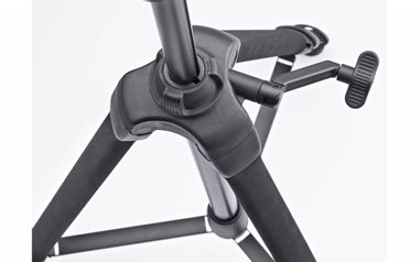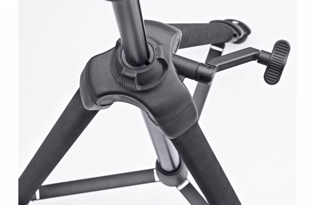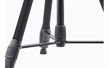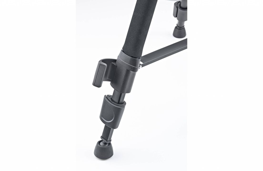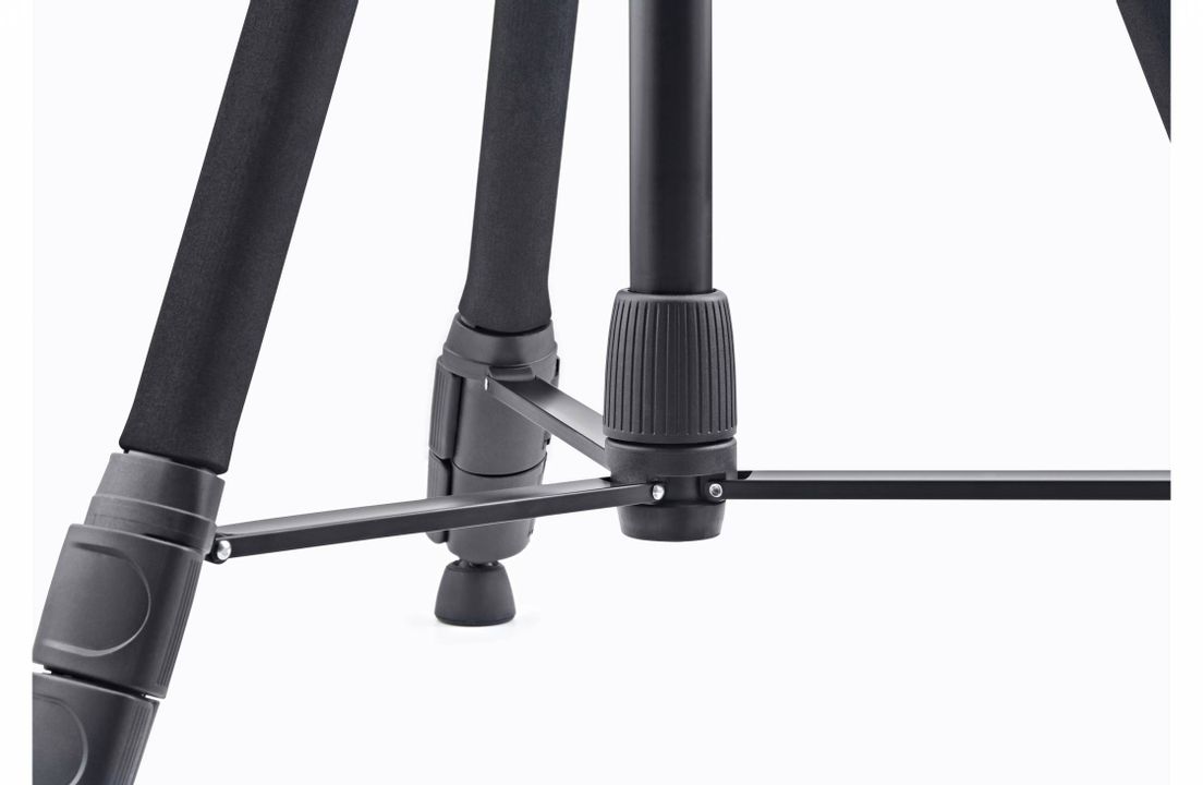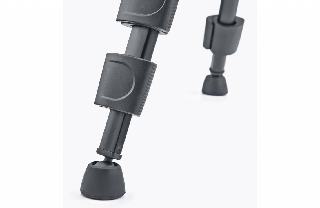 Stativbeine und Mittelsäule sind aus eloxiertem Aluminiumprofil gefertigt und zum Schutz vor Kälte oder Beschädigung, ist das oberste Stativbeinsegment mit einer robusten Schaumstoffummantelung versehen. Die robuste und klemmbare Mittelverstrebung garantiert zusammen mit den um 360 Grad beweglichen Gummifüßen einen stabilen und sicheren Stand. Für ein bequemes Arbeiten sorgen die präzise Verstellung der Mittelsäule mittels Kurbeltrieb sowie die praktischen Schnellspann-Clips für das Einstellen der einzelnen Stativbeine.