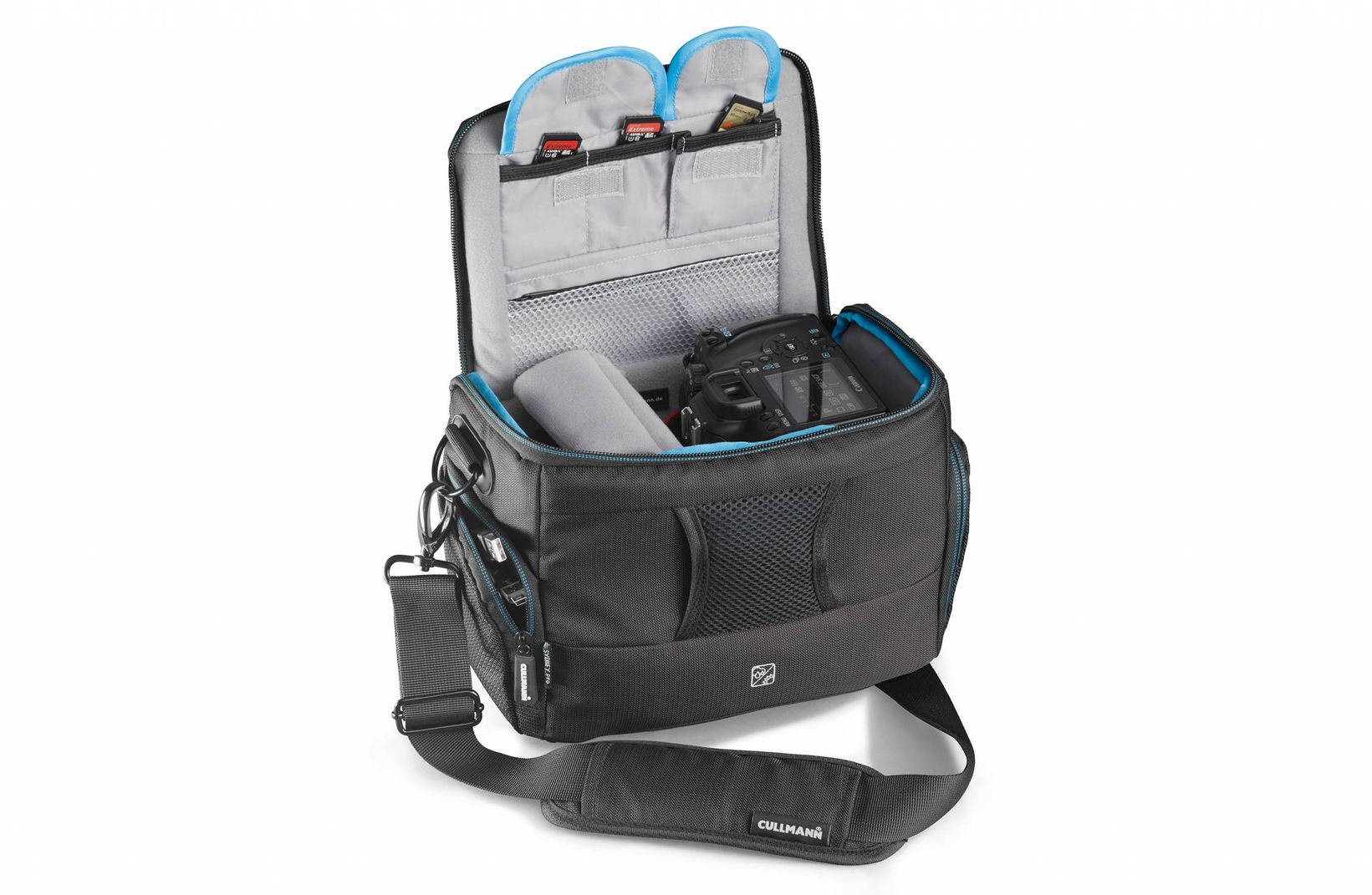 Zuverlässigen Schutz gegen Regen und Sonne garantiert das im Taschenrücken verstaute, passgenaue RAIN / SUN Cover. Verdeckt ausgeführte Reißverschlüsse verhindern zusätzlich das Staub oder Feuchtigkeit eindringen können. Praktische Speicherkartenfächer mit Farbkennzeichnung sorgen dafür, dass Fotografen ihre verschiedenen Speicherkarten auf einen Blick richtig zuordnen können. Zum Verstauen von persönlichen Utensilien und verschiedenem Fotozubehör besitzt die SYDNEY pro Zusatzfächer mit Reißverschluss und variable Inneneinteiler.